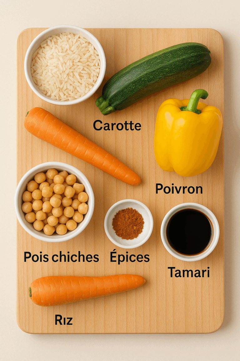 📝 Ingrédients (2 personnes) 1 tasse de riz basmati (ou riz complet) 1 carotte 1 courgette 1 petit poivron (jaune ou rouge) 1 tasse de pois chiches cuits 2 c. à soupe d’huile d’olive 1 c. à café de paprika 1/2 c. à café de cumin Sel et poivre 1 c. à soupe de sauce tamari (sans gluten) Graines de sésame (facultatif) Herbes fraîches (persil, coriandre, ou ciboulette) 🍳 Préparation 🥣 Étape 1 : Cuisson du riz Rincez le riz sous l’eau froide. Faites-le cuire dans 2 fois son volume d’eau bouillante salée pendant 10 à 12 min (selon le type de riz). Égouttez si besoin, réservez au chaud. 🧆 Étape 2 : Préparation des pois chiches croustillants Égouttez les…